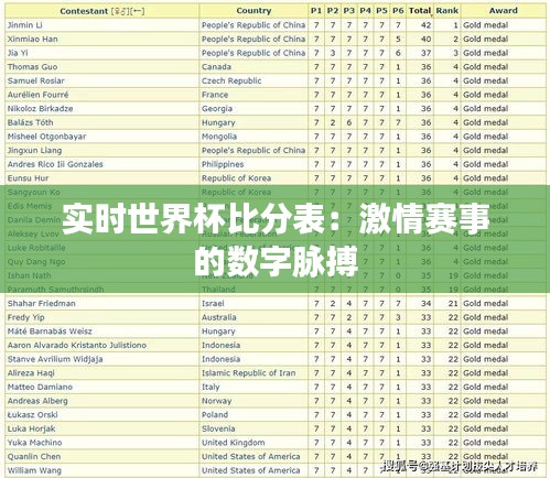 在足球这项全球最受欢迎的运动中,世界杯无疑是球迷们最期待的时刻。每一场比赛都充满了悬念和激情,而实时世界杯比分表则是球迷们获取最新比赛信息的窗口。实时比分表不仅能够展示当前比赛的得分情况,还能提供历史数据和球队排名,对于球迷和分析师来说,都是不可或缺的工具。