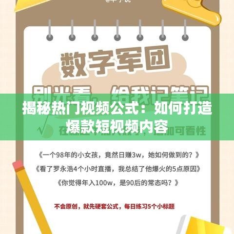 在短视频迅速崛起的今天,打造热门视频已经成为众多内容创作者的追求。而所谓的“热门视频公式”,其实就是一个由多个要素组成的框架,通过这些要素的组合,可以提升视频的吸引力和传播力。以下是几个基本要素:
