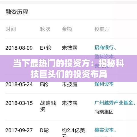 综上所述,当下最热门的投资方主要集中在科技巨头们。他们通过投资布局,不仅实现了自身业务的多元化发展,还在全球范围内寻找新的增长点。这些科技巨头的投资布局,无疑为全球创新和经济增长注入了新的活力。未来,随着科技的发展,我们期待看到更多科技巨头在投资领域创造更多奇迹。