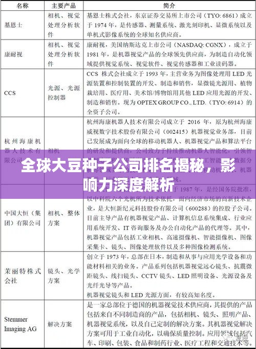 在全球农业产业链中,大豆产业占据着举足轻重的地位,随着农业科技的进步和全球化的发展,国际大豆种子公司的竞争日益激烈,本文将为您揭示国际大豆种子公司的排名及其影响力分析。