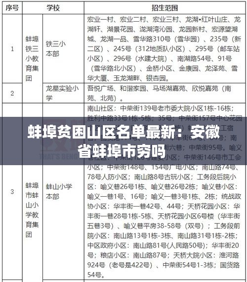 蚌埠市,作为中国安徽省的一个重要城市,近年来在脱贫攻坚战中取得了显著成效。为了进一步明确扶贫对象,精准施策,蚌埠市最新公布了贫困山区名单。本文将为您详细介绍蚌埠贫困山区名单的最新情况,以及政府在脱贫攻坚战中采取的措施。