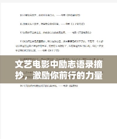 在文艺电影的海洋中,除了精彩的剧情和出色的表演,那些富有哲理和励志意味的语录也时常令人印象深刻,它们或温暖人心,或鼓舞斗志,成为我们生活中不可或缺的精神支柱,本文将带您领略文艺电影中的励志语录摘抄,希望能为您带来正能量和灵感。