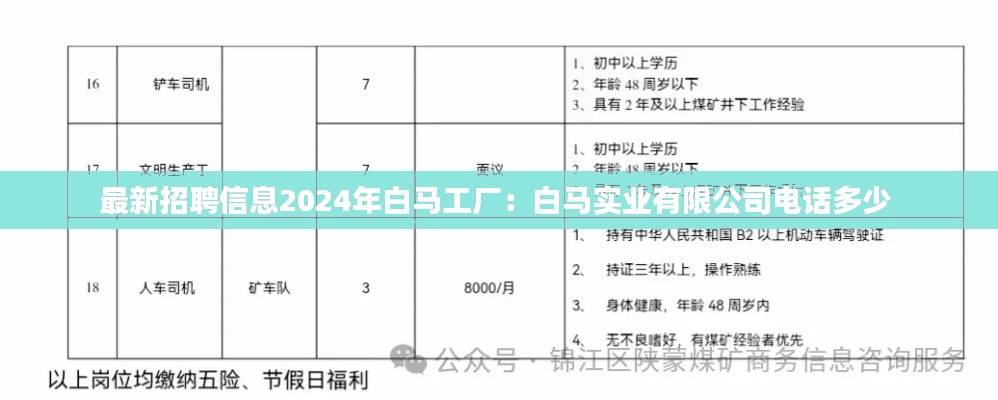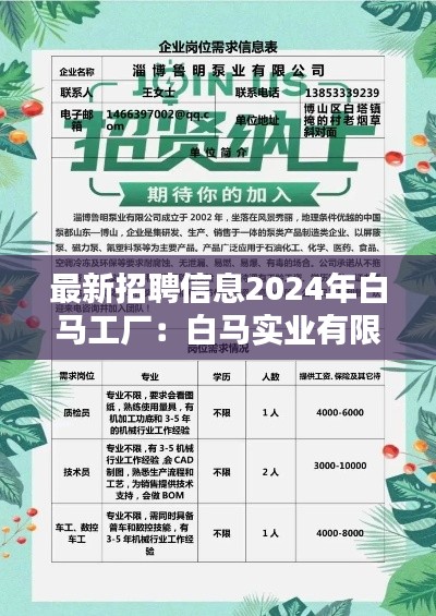 随着公司业务的不断扩展,白马工厂将于2024年启动新一轮的招聘工作。以下是白马工厂2024年的招聘职位及要求: