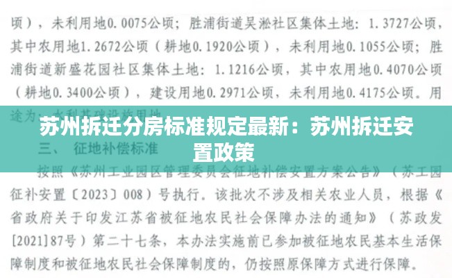 随着城市化进程的加快,苏州地区的拆迁项目日益增多。为了保障拆迁户的合法权益,苏州市政府制定了相应的拆迁分房标准规定。以下是关于苏州拆迁分房标准规定的最新信息概述。