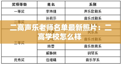 二高,全称为第二高级中学,是一所历史悠久、声誉卓著的学校。该校的音乐教育尤为突出,尤其是声乐教育,吸引了众多有志于音乐艺术的学生。为了让学生和家长更好地了解二高的声乐师资力量,我们特别整理了二高声乐老师的最新名单及照片,以下将为您一一揭晓。