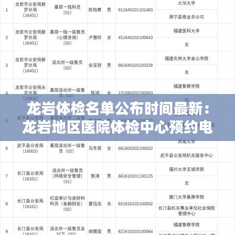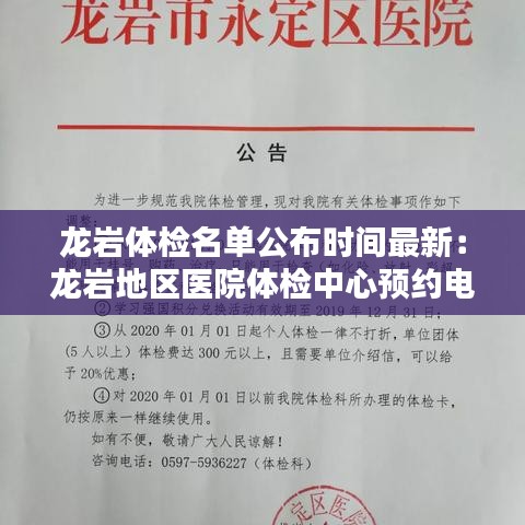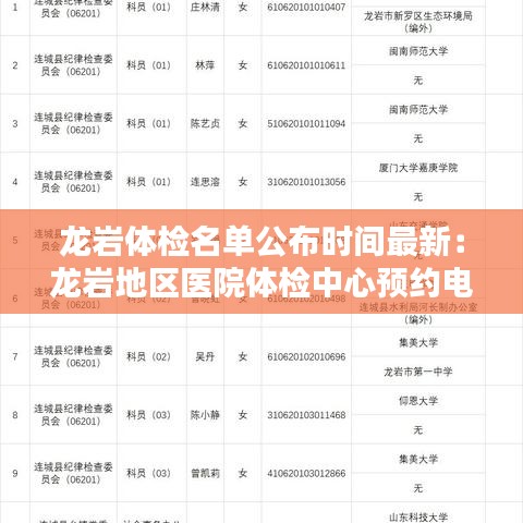 随着社会的发展和人们健康意识的提高,定期体检已经成为许多人生活中不可或缺的一部分。近日,关于龙岩市体检名单公布时间的最新消息引起了广泛关注。本文将为您详细介绍相关信息,帮助您及时了解体检名单的公布情况。