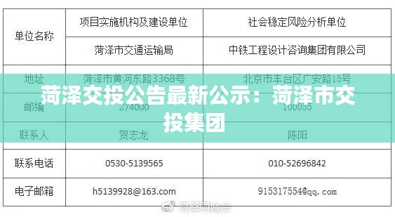 近日,菏泽交通投资集团有限公司(以下简称“菏泽交投”)发布了最新的公示信息,涉及项目进展、招标信息以及公司动态等多个方面。以下是本次公告的主要内容。