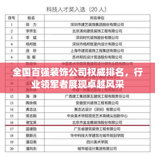 全国百强装饰公司作为行业领军者,以其卓越的设计能力、精湛的施工技艺和优质的服务赢得了广大客户的信赖,在未来,这些公司将继续创新、发展,为装饰行业的繁荣做出更大的贡献,作为消费者,选择全国百强装饰公司,无疑是一个明智的选择,希望通过本文的介绍,您对全国百强装饰公司有了更深入的了解。