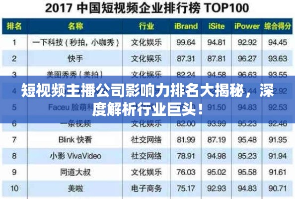 随着互联网的普及和短视频平台的飞速发展,短视频主播行业逐渐崭露头角,成为大众关注的焦点,本文将围绕“短视频主播公司排名”这一主题,探讨当下最受欢迎的短视频主播公司及其影响力。