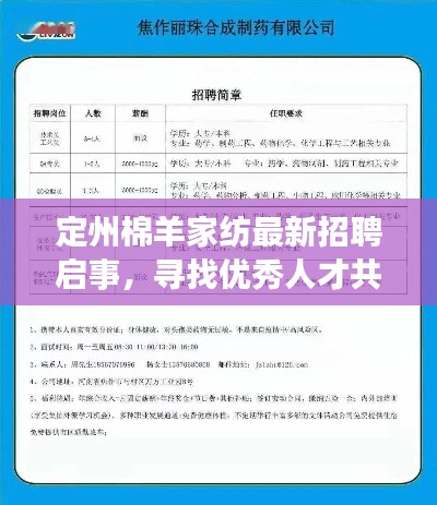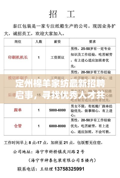 随着纺织行业的不断发展,定州棉羊家纺作为一家知名的家纺企业,一直在寻求优秀人才的加入,本文将为您介绍定州棉羊家纺的最新招聘信息,为您提供一个了解该公司招聘动态的机会。