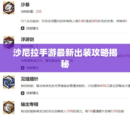 随着移动游戏的飞速发展,沙尼拉手游作为一款热门的竞技游戏,受到了众多玩家的喜爱,在游戏中,合理的出装选择对于玩家来说至关重要,本文将为大家带来沙尼拉手游出装的最新攻略,帮助玩家更好地掌握游戏角色,提升战斗能力。