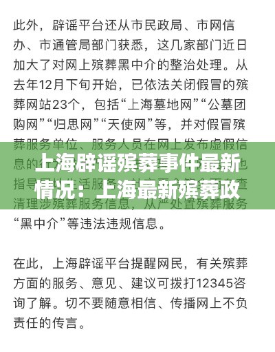 近日,关于上海发生殡葬事件的传闻在网络上迅速传播,引发了广泛关注。据悉,这起事件涉及一起疑似违规殡葬活动,以及由此引发的公众恐慌和质疑。为了澄清事实,相关部门迅速介入调查,并发布官方信息进行辟谣。