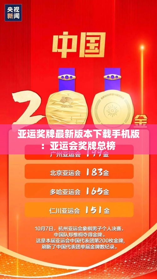 随着亚运会的日益临近,许多体育迷们都期待着能够通过手机应用来获取最新的亚运会信息。今天,我们为大家带来了亚运奖牌的最新版本下载手机版,让您随时随地掌握奖牌的最新动态。