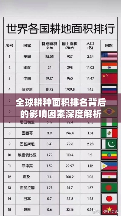 随着全球人口的增长和城市化进程的加速,农业作为人类赖以生存的基础产业,其重要性日益凸显,耕种面积作为衡量一个国家农业发展程度的重要指标之一,反映了该国的农业生产潜力和粮食安全保障能力,本文将针对世界耕种面积国家排名进行简要介绍,并分析其背后的影响因素。