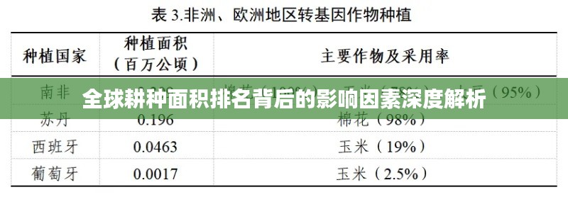 随着全球经济的发展和人口结构的变化,各国耕种面积也在不断变化,一些国家通过土地改革、农业科技创新等措施,成功扩大了耕种面积,提高了农业生产效率,随着科技的不断进步和全球气候变化的影响,各国耕种面积的变化将更加复杂。