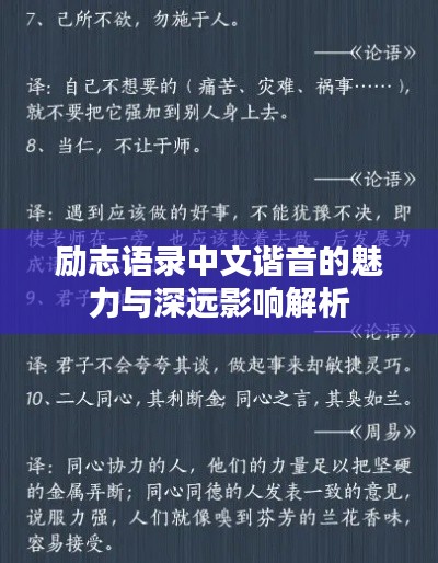 这些励志语录中文谐音,虽然看似简单,却对人的心灵有着深远的影响,它们像一面镜子,反映出我们内心的渴望和追求;像一股清泉,滋润着我们的心灵,它们鼓励我们勇敢面对困难,坚定信念,追求梦想,这种影响是深远的,不仅影响我们的行为,更影响我们的价值观和精神世界。