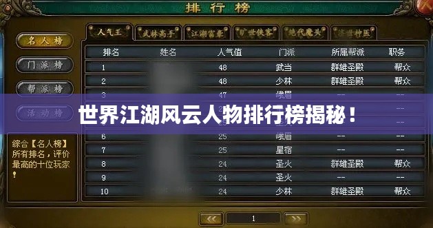 江湖,自古以来便是英雄豪杰的汇聚之地,在世界各地的历史长河中,涌现出无数风云人物,他们以其独特的魅力和影响力,成为江湖中的传奇人物,本文将为您呈现世界江湖人物的排名,带您领略他们的风采。