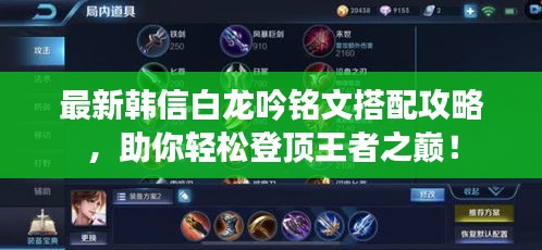 本文为大家带来了最新的韩信白龙吟铭文攻略,包括铭文选择、升级方法、装备选择、技能加点和实战技巧等方面的内容,希望玩家们能够通过对本文的学习,更好地掌握韩信这个英雄,提高自己的实战能力,在游戏中取得更好的成绩,享受游戏的乐趣。