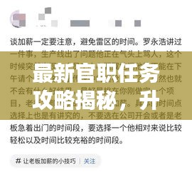 在现今社会,随着竞争的日益激烈,升职加薪已成为众多职场人士的共同目标,如何快速升职加薪?最新的官职任务攻略或许能为你指明方向,本文将为你详细介绍如何通过完成官职任务,实现职位晋升和薪资提升。