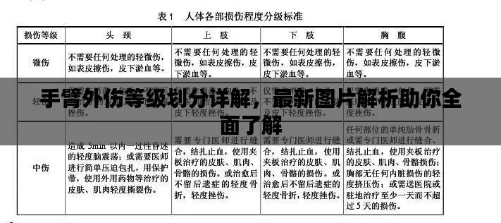 手臂外伤是日常生活中常见的损伤之一,其严重程度和等级划分对于正确的诊断和治疗具有重要意义,本文将详细介绍手臂外伤的等级划分,并配以最新图片,以便更好地理解和识别各种外伤等级。