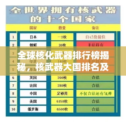 随着全球安全形势的不断变化,核武器的地位和影响力愈发凸显,各国核武器的数量和质量直接关系到其在国际事务中的地位和影响力,本文将为您带来世界核化武器排名,揭示全球核力量的分布格局。