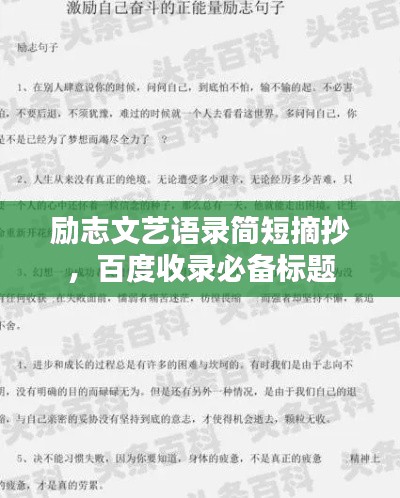 在人生的道路上,我们需要不断地鼓励和激励自己,以上这些文艺摘抄语录励志简短正是我们前行的动力和信念,让我们以此为鼓励,勇敢追梦,创造属于自己的精彩人生。