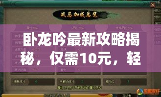 就是针对卧龙吟10元最新攻略的详细介绍,希望本文能够帮助玩家更好地体验游戏,特别是在有限的预算下,充分利用资源,享受游戏的乐趣,在游戏中,不断学习和探索新的攻略和技巧,会让你的游戏之旅更加精彩。