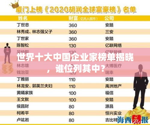 这十位中国企业家在全球商业领域具有广泛的影响力,他们的成功故事和创业经历不仅在中国国内广受赞誉,也在全球范围内受到关注,他们的成功背后蕴含着创新、勇气、智慧和勤奋的精神,这些精神值得我们学习和借鉴。