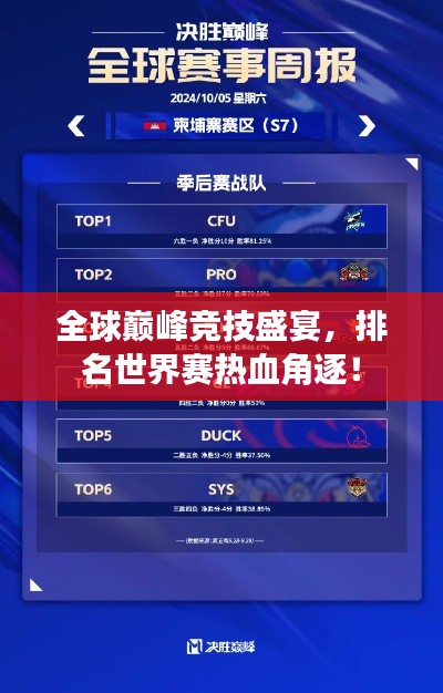 排名世界赛汇聚了全球顶尖的选手和队伍,比赛规模庞大,竞技水平极高,参赛选手需要经过层层选拔,才能跻身这场荣誉之战,在赛场上,他们不仅要面对其他选手的强劲挑战,还要面对各种压力和挑战,只有具备出色的竞技实力、顽强的意志品质和卓越的团队协作能力,才能在激烈的竞争中脱颖而出。