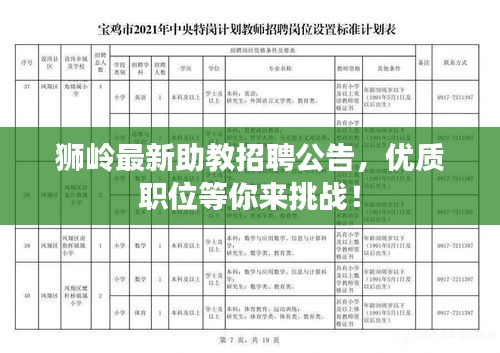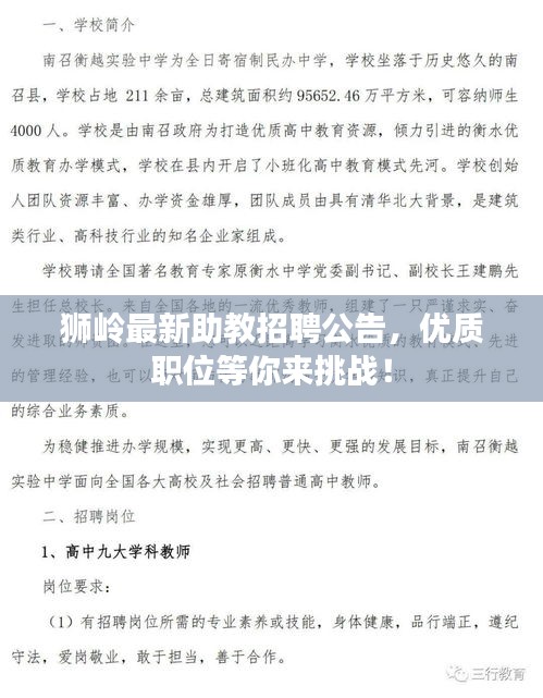 随着教育事业的蓬勃发展,狮岭地区对优秀教育人才的需求日益增长,为满足学校教学工作的需要,现面向社会公开招聘助教若干名,本次招聘公告旨在吸引更多有志于教育事业的优秀人才加入我们的团队,共同为狮岭地区的教育事业贡献力量。