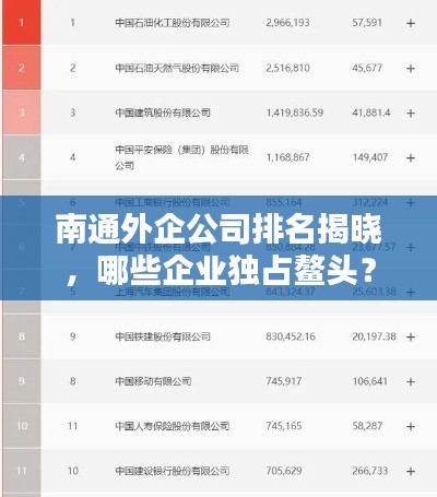 南通,这座长江三角洲的重要城市,近年来经济发展迅速,吸引了众多外企进驻,这些外企公司不仅为南通带来了先进的生产技术和管理经验,也为南通的经济增长注入了新的活力,本文将为您介绍南通外企公司的排名,带您了解这些企业的风采。