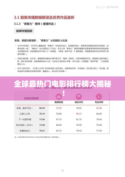 世界上最热搜的电影排名中的这些电影都是电影史上的经典之作,它们以其出色的表现、精彩的剧情和卓越的口碑赢得了全球观众的喜爱和关注,这些电影不仅让我们享受到了视听盛宴,也让我们对电影这一艺术形式有了更深刻的认识和理解,在未来,随着电影行业的不断发展,我们相信会有更多优秀的电影涌现,成为新的热搜焦点。
