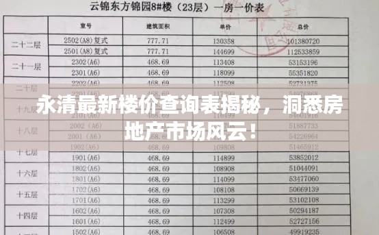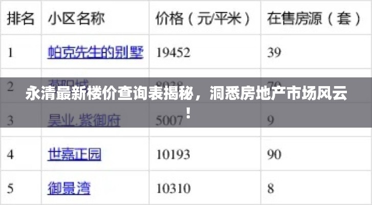 随着城市化进程的加速,房地产市场日新月异,了解最新的房价信息对于购房者来说至关重要,本文将围绕“永清今日楼价查询表最新”这一主题,为您解析当前永清地区的房地产市场的最新动态。