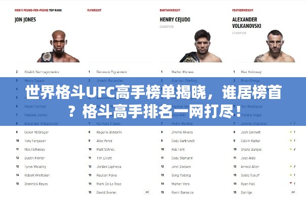 是世界格斗UFC的高手排名,这些选手在八角笼中展现出了惊人的实力和技艺,他们的表现不仅赢得了全球粉丝的尊敬和喜爱,同时也推动了格斗运动的发展。