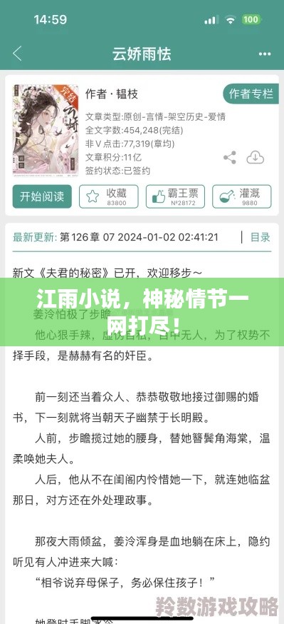 江雨是一位才华横溢的小说家,他的作品多以都市情感、历史传奇等题材为主,他的小说情节曲折、文笔优美,深受读者喜爱,江雨的小说常常通过讲述人物的故事,展现出人性的复杂和丰富,让读者在阅读过程中产生共鸣和情感共振。