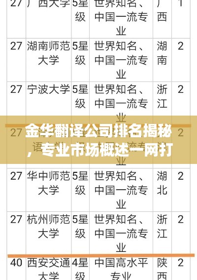 随着全球化的发展,翻译行业逐渐崭露头角,成为连接不同语言和文化的重要桥梁,金华作为浙江省的重要城市,其翻译市场亦日渐繁荣,本文将探讨金华翻译公司的排名及其市场概况。