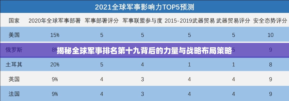 在全球化的时代背景下,各国军事力量的强弱直接关系到国家的安全与发展,而世界军事排名第19名,作为其中的一员,其背后所代表的力量与策略值得我们深入探讨,本文将为您揭示这一名次背后所蕴含的内涵与外延,以及其未来的发展趋势。