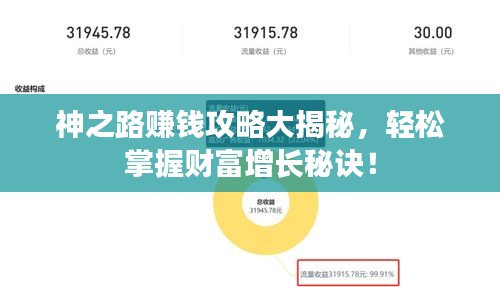 随着网络的发展与普及,越来越多的人投身于各种游戏世界,其中不乏热衷于“神之路”这款游戏的玩家,在神之路中,除了享受游戏本身的乐趣外,赚钱、积累财富也是许多玩家的目标,本文将为大家带来最新的神之路赚钱攻略,助你轻松掌握财富增长之道。