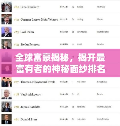 随着全球经济的高速发展,世界各地涌现出了一批又一批的杰出企业家、投资大佬和顶级富豪,他们凭借自身的智慧和努力,创造了一个又一个的商业奇迹,成为了全球最富有的人,本文将为您揭晓世界土豪排名,带您领略这些神秘人物的财富人生。