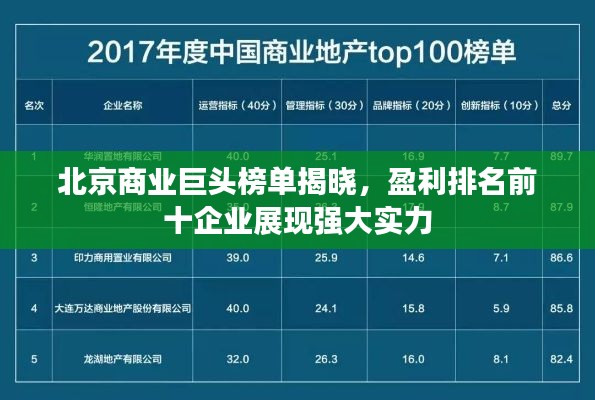 随着全球经济的蓬勃发展,北京作为中国的首都和经济中心之一,企业盈利状况一直备受关注,本文将为您揭示北京企业盈利排名前十名的企业,这些企业在各自的领域内均取得了骄人的业绩,展现了首都商业的巨大潜力。