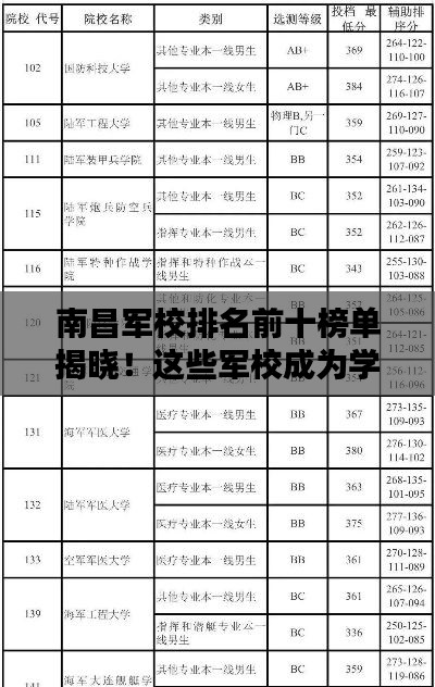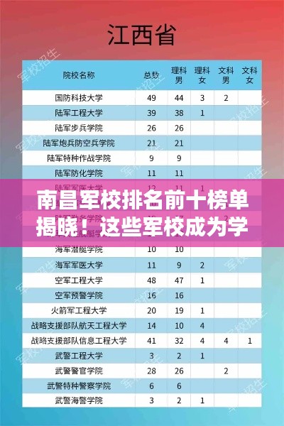 军事院校在我国的教育体系中占有重要的地位,为社会培养了大批的军事人才,南昌作为我国的军事重镇,拥有众多优秀的军校,以下是南昌军校排名前十名,让我们一起了解一下。