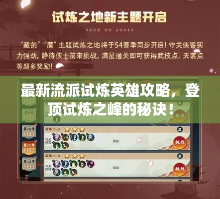 试炼之峰,那是一个充满挑战与机遇的世界,英雄们的勇敢与智慧将得到最严格的考验,本文将为你带来最新的“流派试炼英雄攻略”,助你成为试炼之峰的佼佼者。