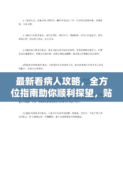 探望病人是我们在生活中常常会遇到的情况,无论是亲朋好友还是亲人,我们都希望能够为他们带去关爱与安慰,如何正确探望病人,让病人感受到温暖而不是负担,这就需要我们了解一些基本的攻略和技巧,本文将为你提供最新的看病人攻略,帮助你顺利探望,让病人感受到你的关心与温暖。
