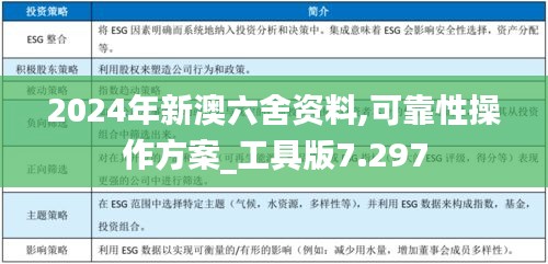 随着澳门特别行政区对可持续发展和城市建设的重视,2024年新澳六舍资料可靠性操作方案——工具版7.297应运而生。该方案旨在为澳门特别行政区提供一套全面的、系统的资料可靠性操作指南,以确保城市的基础设施和公共服务能够高效运作,满足居民和游客的需求。本文件将详细介绍该方案的内容、目标、以及实施步骤。