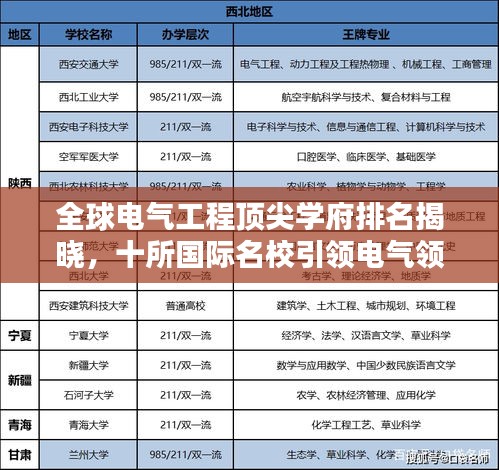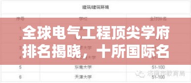 随着科技的飞速发展,电气工程领域日益受到全球关注,本文为您带来电气国际名校排名前十名,这些学府不仅是学术研究的重镇,也是培养电气工程领域优秀人才的摇篮。
