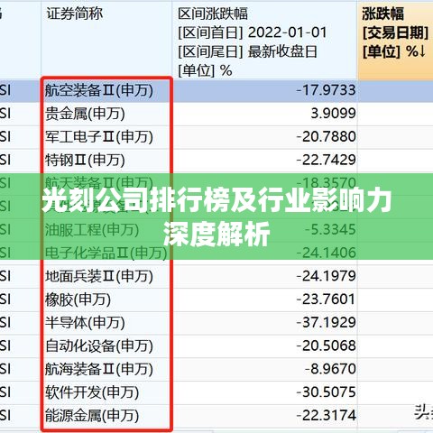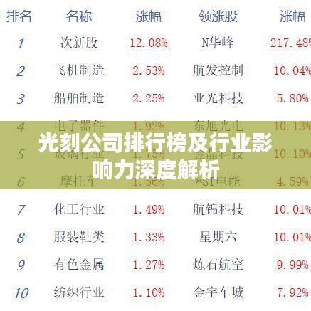 随着科技的飞速发展,光刻技术已成为现代电子制造业的核心工艺之一,本文将介绍全球光刻公司排名及其影响力,让读者了解这些公司在推动行业发展和技术创新方面的作用。