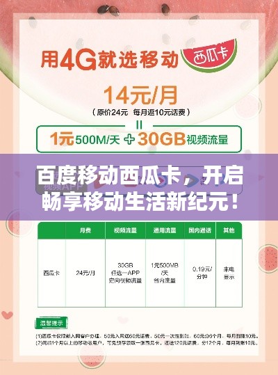 移动西瓜卡是百度为用户打造的一种全新的移动支付服务,它以其便捷、实惠、多元和安全的特点,为用户带来了全新的移动生活体验,让我们一起“百度一下移动西瓜卡”,畅享移动生活的无限魅力吧!