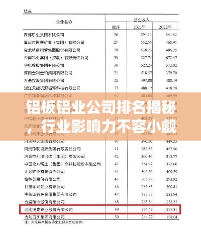 铝板铝业作为现代工业的重要支柱之一,在全球范围内拥有广泛的应用领域,包括建筑、交通、包装等多个行业,随着市场需求的不断增长,铝板铝业公司也在全球范围内蓬勃发展,本文将探讨全球范围内铝板铝业公司的排名及其行业影响力。