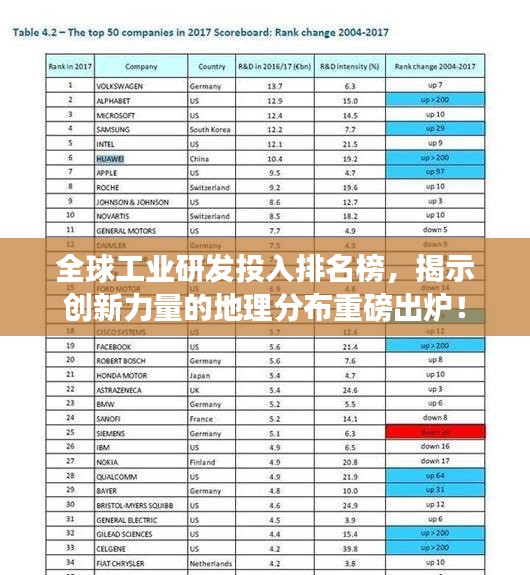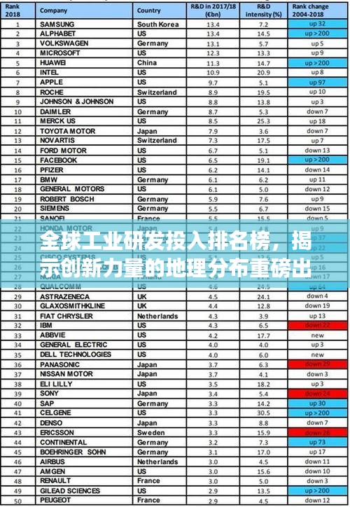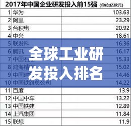 随着科技的飞速发展和全球化竞争的加剧,工业研发投入已经成为衡量一个国家科技实力和创新能力的关键指标之一,世界工业研发投入排名榜的发布,为我们揭示了全球范围内工业研发领域的竞争格局和创新力量的分布,本文将围绕这一主题展开,探讨全球工业研发投入的现状和未来趋势。