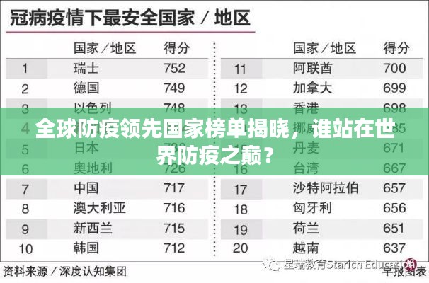 随着全球疫情的蔓延,各国防疫工作的成效逐渐受到广泛关注,在这场全球性的抗疫战争中,一些国家在防疫工作中的卓越表现令人瞩目,本文将探讨目前世界第一防疫国家的排名及其成功经验。